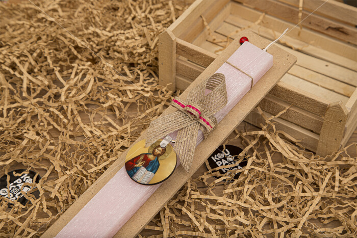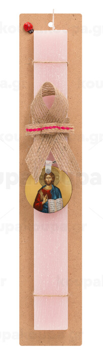 Ιησούς, Πασχαλινή Λαμπάδα με ξύλινο μπρελόκ & κερί αρωματικό πλακέ (30cm) (ΡΟΖ)