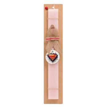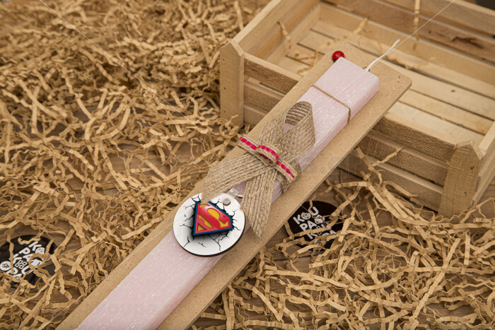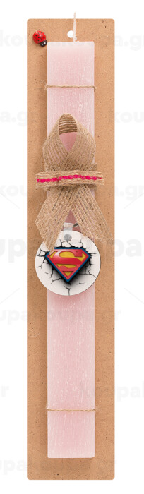 Superman cracked, Πασχαλινή Λαμπάδα με ξύλινο μπρελόκ & κερί αρωματικό πλακέ (30cm) (ΡΟΖ)