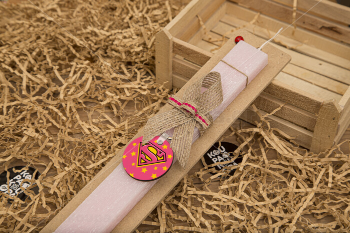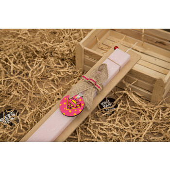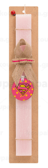 Superman Pink, Πασχαλινή Λαμπάδα με ξύλινο μπρελόκ & κερί αρωματικό πλακέ (30cm) (ΡΟΖ)
