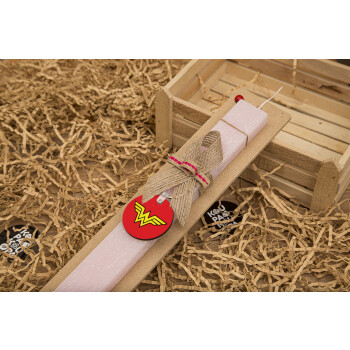 Wonder woman, Πασχαλινή Λαμπάδα με ξύλινο μπρελόκ & κερί αρωματικό πλακέ (30cm) (ΡΟΖ)