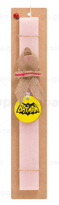 Batman classic logo, Πασχαλινή Λαμπάδα με ξύλινο μπρελόκ & κερί αρωματικό πλακέ (30cm) (ΡΟΖ)