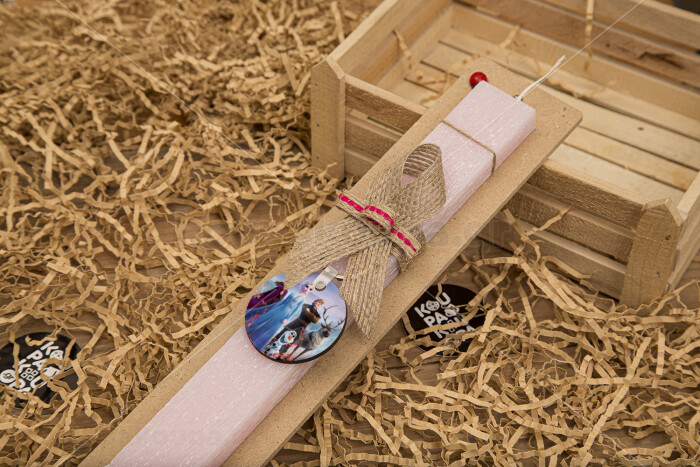 Frozen, Πασχαλινή Λαμπάδα με ξύλινο μπρελόκ & κερί αρωματικό πλακέ (30cm) (ΡΟΖ)