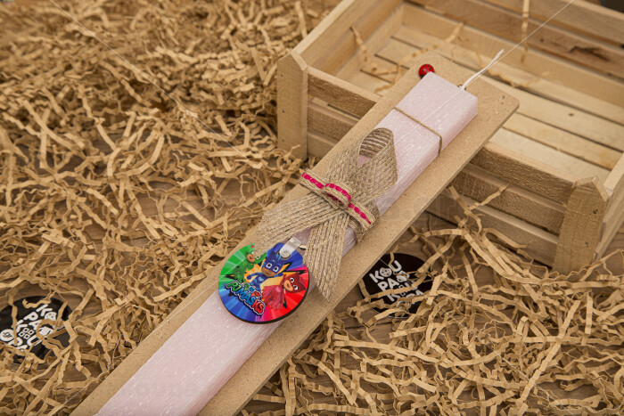 PJ masks, Πασχαλινή Λαμπάδα με ξύλινο μπρελόκ & κερί αρωματικό πλακέ (30cm) (ΡΟΖ)