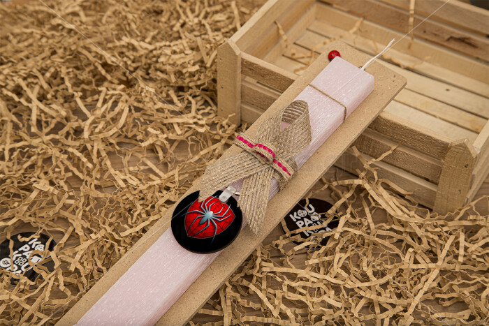 Spider-man, Πασχαλινή Λαμπάδα με ξύλινο μπρελόκ & κερί αρωματικό πλακέ (30cm) (ΡΟΖ)