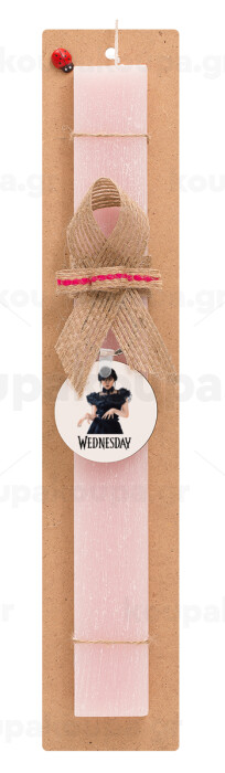 Wednesday Adams, dance with hands, Πασχαλινή Λαμπάδα με ξύλινο μπρελόκ & κερί αρωματικό πλακέ (30cm) (ΡΟΖ)