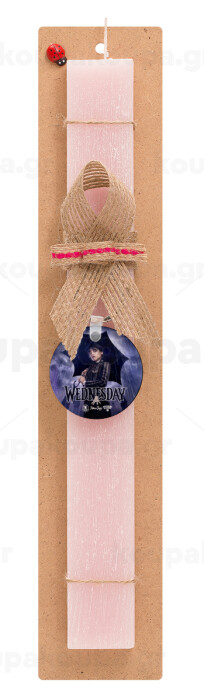 Wednesday rain, Πασχαλινή Λαμπάδα με ξύλινο μπρελόκ & κερί αρωματικό πλακέ (30cm) (ΡΟΖ)