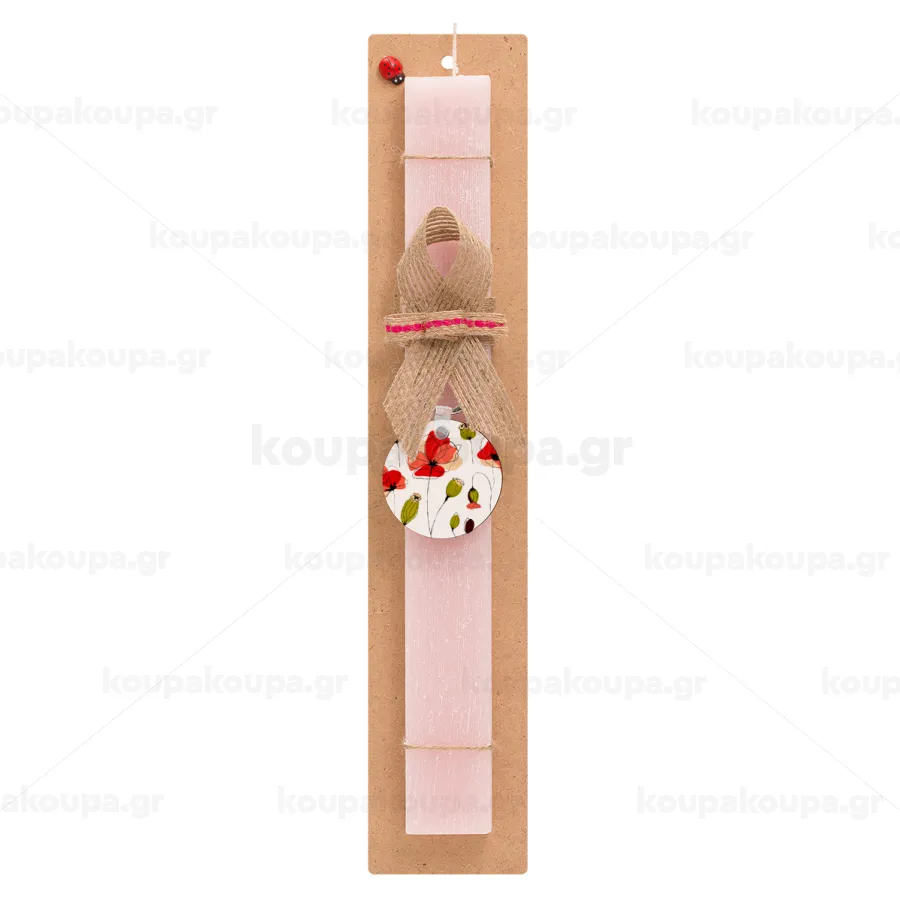 Red poppy flowers papaver, Πασχαλινή Λαμπάδα με ξύλινο μπρελόκ & κερί αρωματικό πλακέ (30cm) (ΡΟΖ)