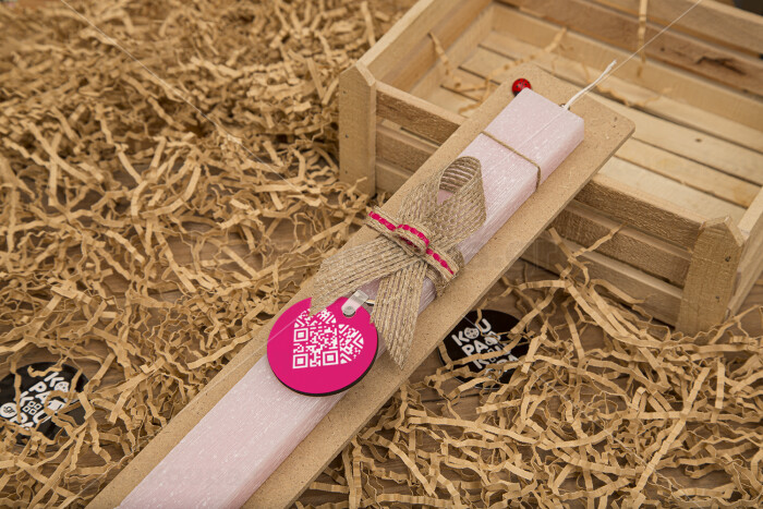 Heart hidden MSG, try me!!!, Πασχαλινή Λαμπάδα με ξύλινο μπρελόκ & κερί αρωματικό πλακέ (30cm) (ΡΟΖ)