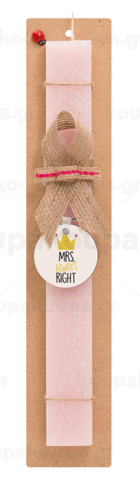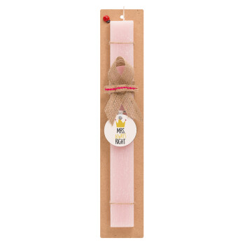 Mrs "Always" right, Πασχαλινή Λαμπάδα με ξύλινο μπρελόκ & κερί αρωματικό πλακέ (30cm) (ΡΟΖ)