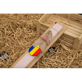 Romania flag, Πασχαλινή Λαμπάδα με ξύλινο μπρελόκ & κερί αρωματικό πλακέ (30cm) (ΡΟΖ)