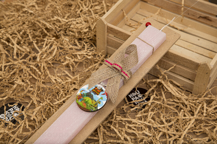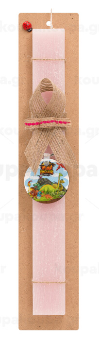 Dinosaur's world, Πασχαλινή Λαμπάδα με ξύλινο μπρελόκ & κερί αρωματικό πλακέ (30cm) (ΡΟΖ)