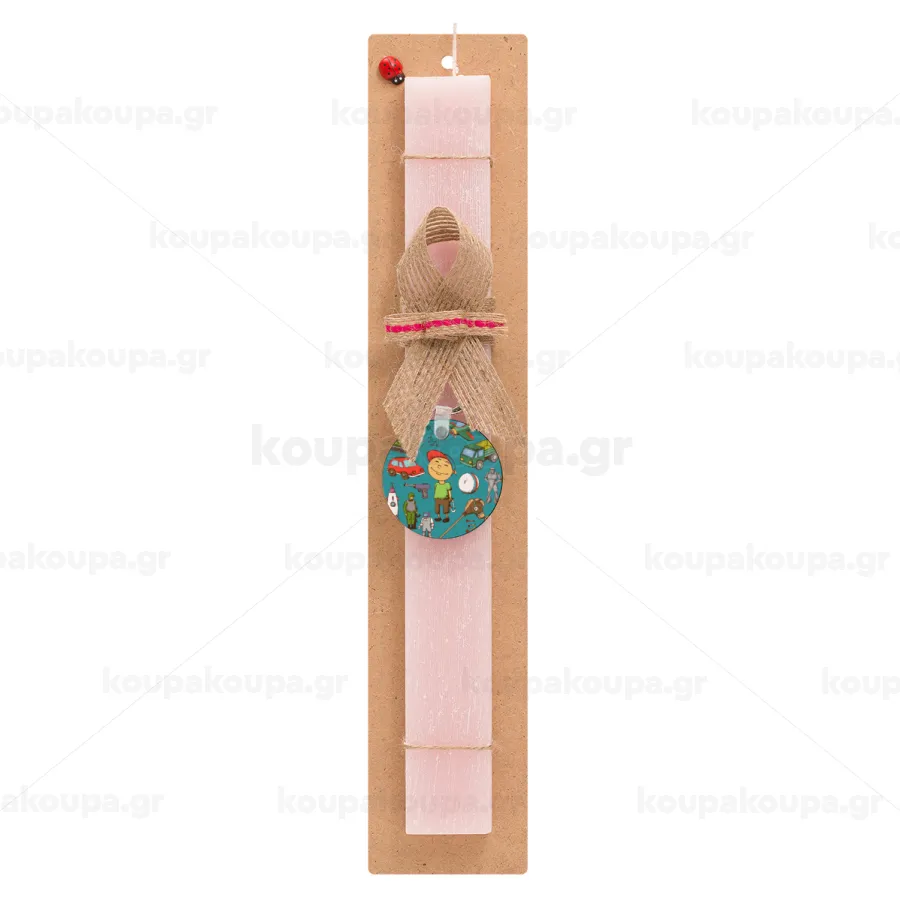Toys Boy, Πασχαλινή Λαμπάδα με ξύλινο μπρελόκ & κερί αρωματικό πλακέ (30cm) (ΡΟΖ)