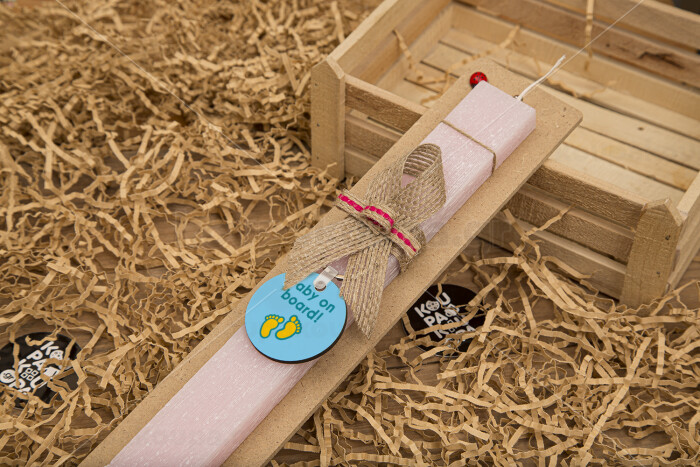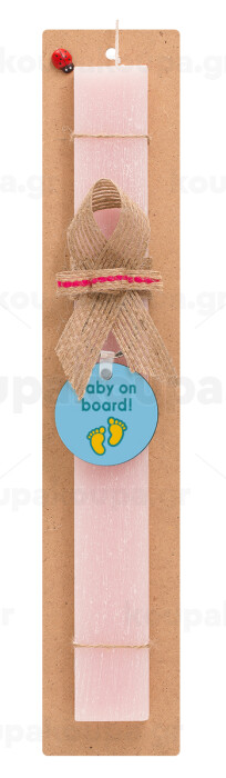 Baby on Board πατουσα Αγόρι, Πασχαλινή Λαμπάδα με ξύλινο μπρελόκ & κερί αρωματικό πλακέ (30cm) (ΡΟΖ)