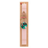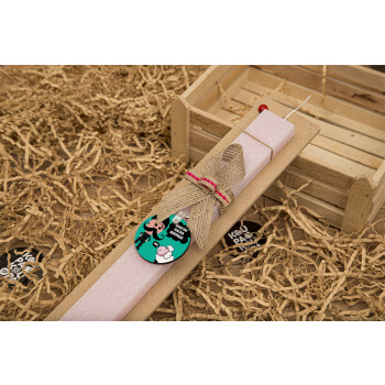 Κρητικός "Έρχεται Πάσχα κουράδι", Πασχαλινή Λαμπάδα με ξύλινο μπρελόκ & κερί αρωματικό πλακέ (30cm) (ΡΟΖ)