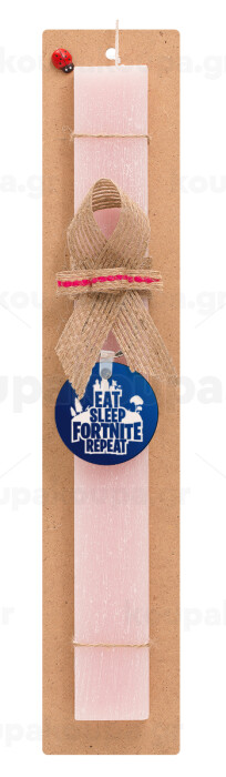 Eat Sleep Fortnite Repeat, Πασχαλινή Λαμπάδα με ξύλινο μπρελόκ & κερί αρωματικό πλακέ (30cm) (ΡΟΖ)