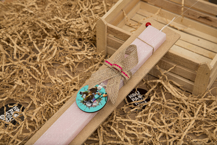 Minecraft brick, Πασχαλινή Λαμπάδα με ξύλινο μπρελόκ & κερί αρωματικό πλακέ (30cm) (ΡΟΖ)