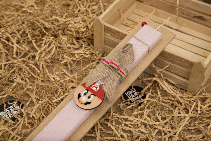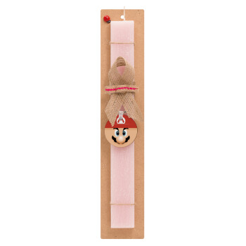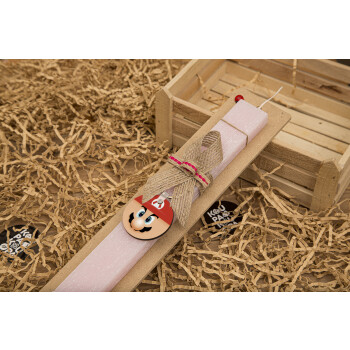 Super mario flat, Πασχαλινή Λαμπάδα με ξύλινο μπρελόκ & κερί αρωματικό πλακέ (30cm) (ΡΟΖ)