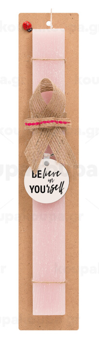 Believe in your self, Πασχαλινή Λαμπάδα με ξύλινο μπρελόκ & κερί αρωματικό πλακέ (30cm) (ΡΟΖ)