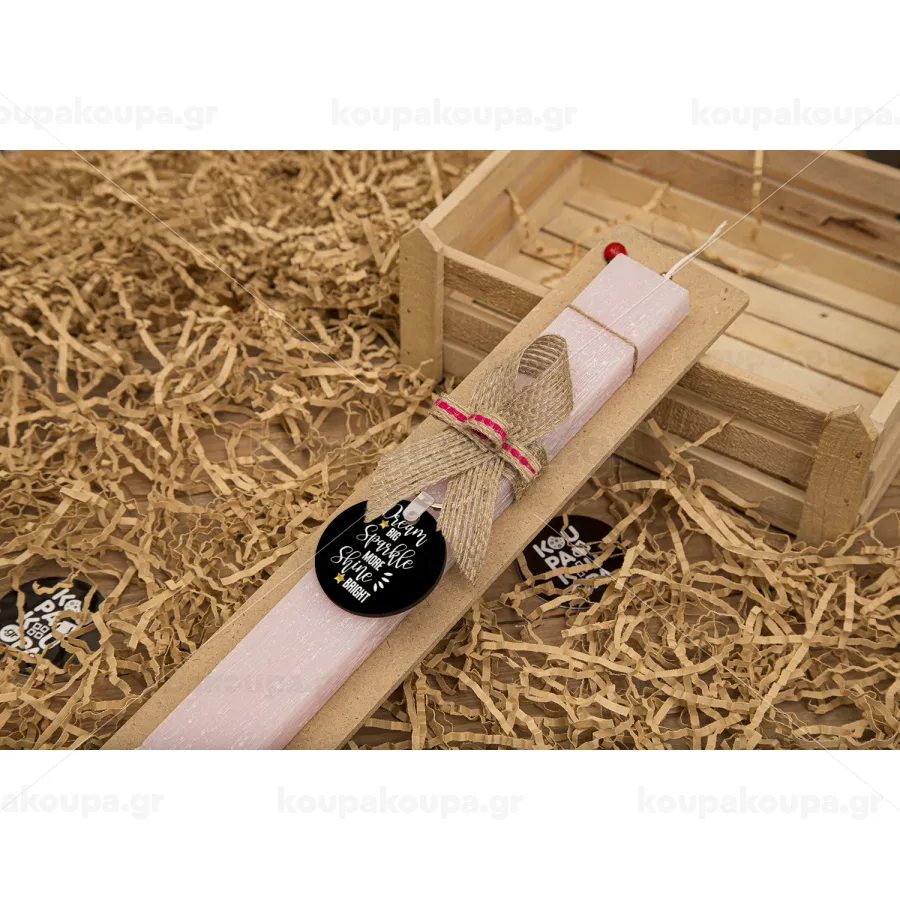 Dream big, Sparkle more, Shine bright, Πασχαλινή Λαμπάδα με ξύλινο μπρελόκ & κερί αρωματικό πλακέ (30cm) (ΡΟΖ)