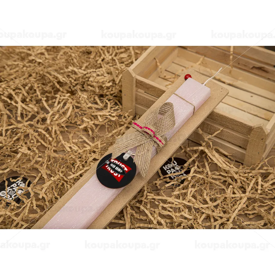 Trust no one... (zipper), Πασχαλινή Λαμπάδα με ξύλινο μπρελόκ & κερί αρωματικό πλακέ (30cm) (ΡΟΖ)