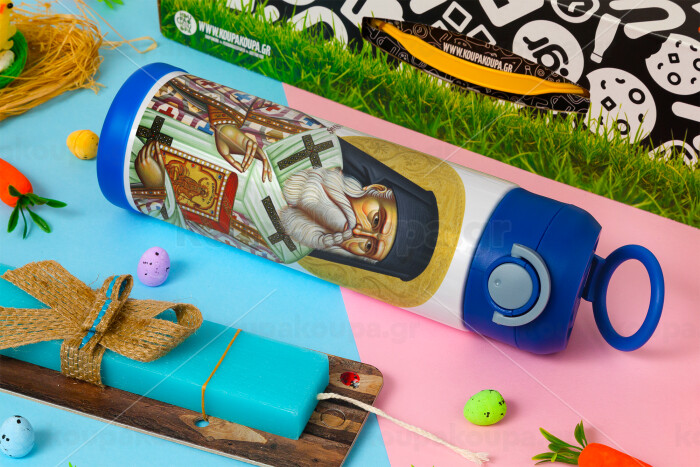 Άγιος Νεκτάριος, Πασχαλινή Λαμπάδα με Παιδικό παγούρι θερμό, ανοξείδωτο, με καλαμάκι ασφαλείας, ΜΠΛΕ (500ml)
