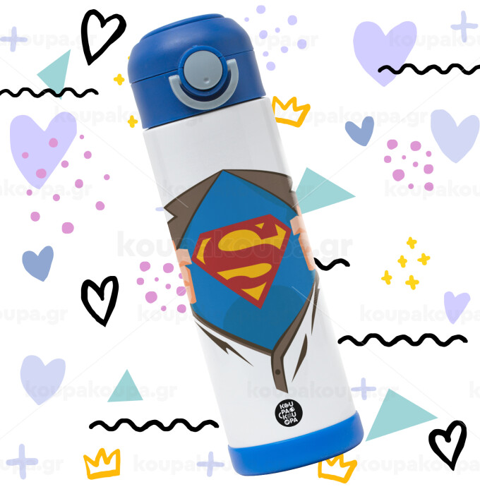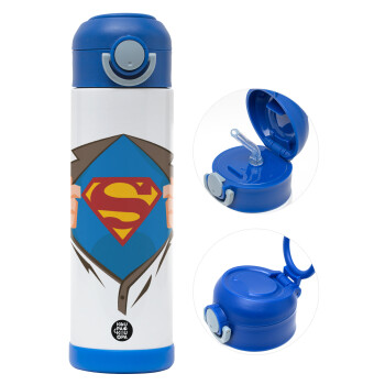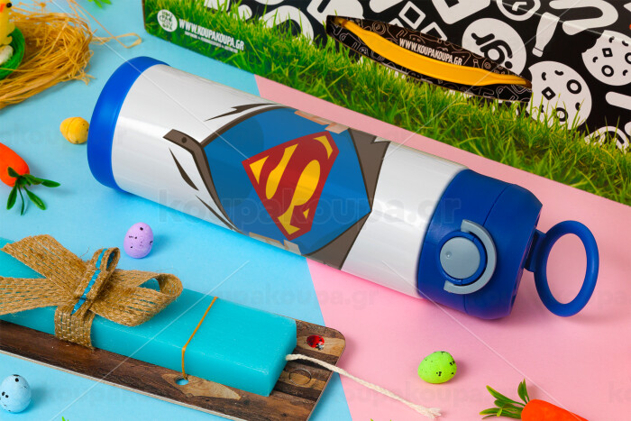 Superman hands, Πασχαλινή Λαμπάδα με Παιδικό παγούρι θερμό, ανοξείδωτο, με καλαμάκι ασφαλείας, ΜΠΛΕ (500ml)