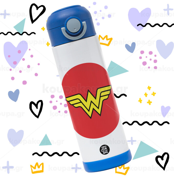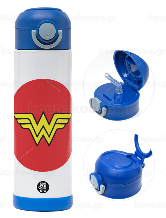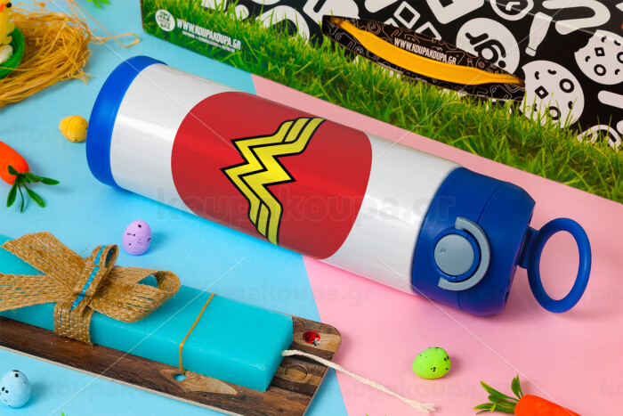 Wonder woman, Πασχαλινή Λαμπάδα με Παιδικό παγούρι θερμό, ανοξείδωτο, με καλαμάκι ασφαλείας, ΜΠΛΕ (500ml)
