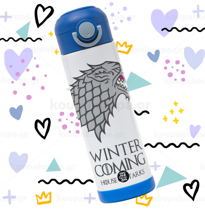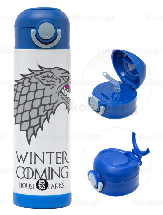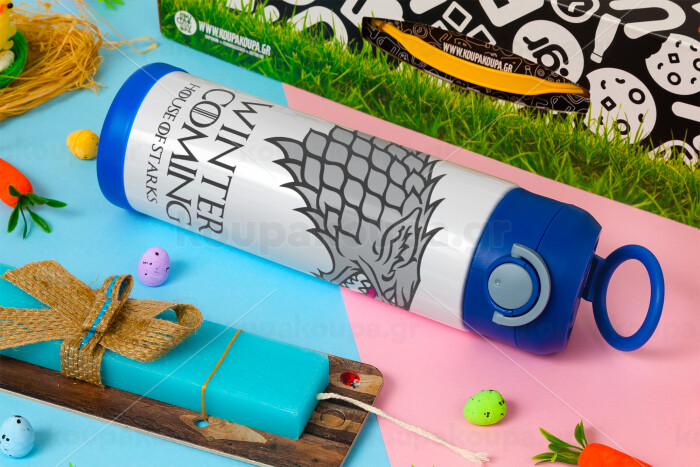 GOT House of Starks, winter coming, Πασχαλινή Λαμπάδα με Παιδικό παγούρι θερμό, ανοξείδωτο, με καλαμάκι ασφαλείας, ΜΠΛΕ (500ml)
