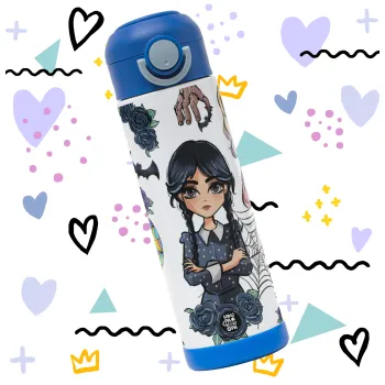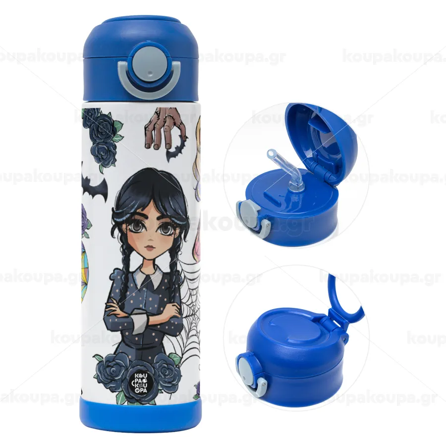 Wednesday and Enid Sinclair, Πασχαλινή Λαμπάδα με Παιδικό παγούρι θερμό, ανοξείδωτο, με καλαμάκι ασφαλείας, ΜΠΛΕ (500ml)