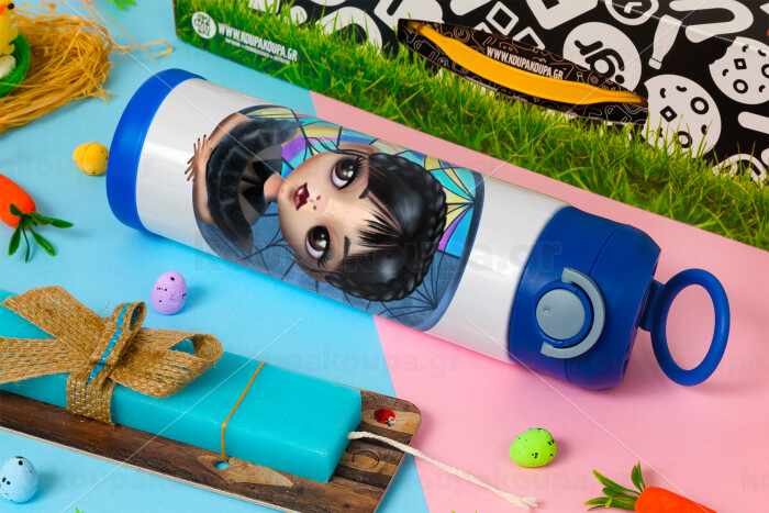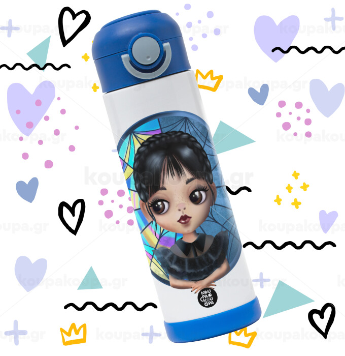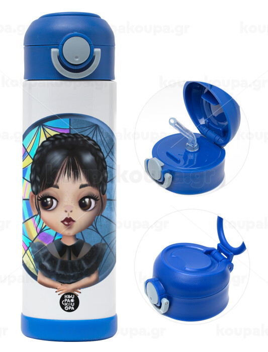Wednesday big eyes, Πασχαλινή Λαμπάδα με Παιδικό παγούρι θερμό, ανοξείδωτο, με καλαμάκι ασφαλείας, ΜΠΛΕ (500ml)