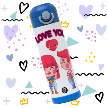 Couple, I love you, Πασχαλινή Λαμπάδα με Παιδικό παγούρι θερμό, ανοξείδωτο, με καλαμάκι ασφαλείας, ΜΠΛΕ (500ml)