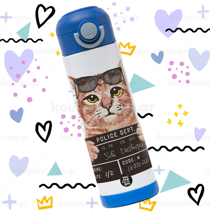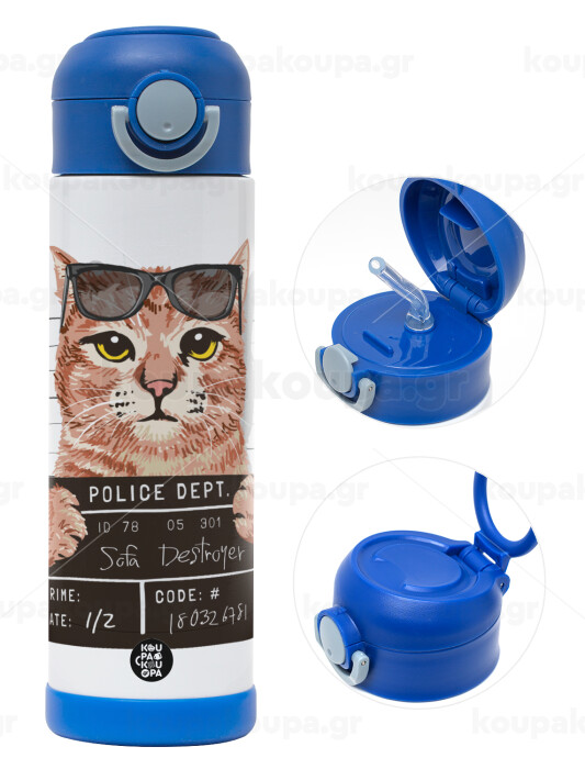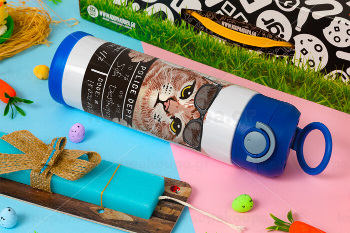 Cool cat, Πασχαλινή Λαμπάδα με Παιδικό παγούρι θερμό, ανοξείδωτο, με καλαμάκι ασφαλείας, ΜΠΛΕ (500ml)