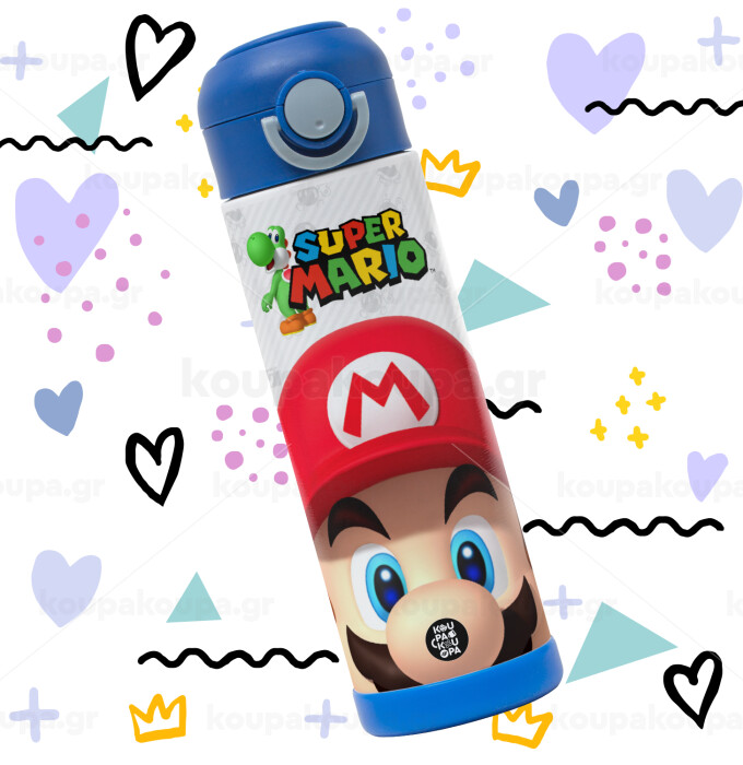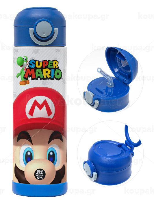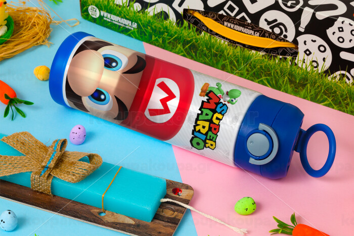 Super mario, Πασχαλινή Λαμπάδα με Παιδικό παγούρι θερμό, ανοξείδωτο, με καλαμάκι ασφαλείας, ΜΠΛΕ (500ml)