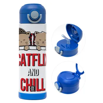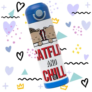 Catflix and Chill, Πασχαλινή Λαμπάδα με Παιδικό παγούρι θερμό, ανοξείδωτο, με καλαμάκι ασφαλείας, ΜΠΛΕ (500ml)