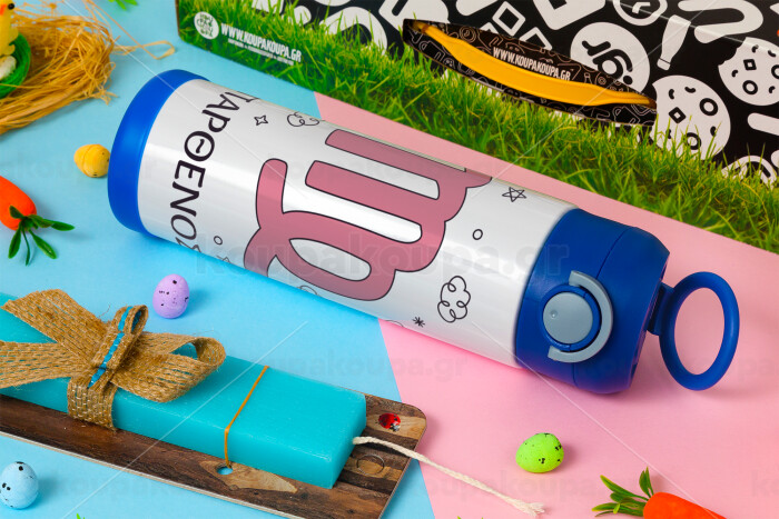 Ζώδια Παρθένος, Πασχαλινή Λαμπάδα με Παιδικό παγούρι θερμό, ανοξείδωτο, με καλαμάκι ασφαλείας, ΜΠΛΕ (500ml)