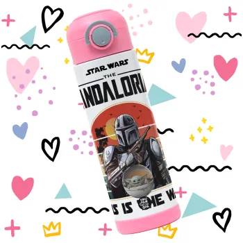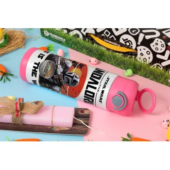 Mandalorian, Πασχαλινή Λαμπάδα με Παιδικό παγούρι θερμό, ανοξείδωτο, με καλαμάκι ασφαλείας, ΡΟΖ (500ml)