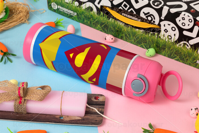 Superman flat, Πασχαλινή Λαμπάδα με Παιδικό παγούρι θερμό, ανοξείδωτο, με καλαμάκι ασφαλείας, ΡΟΖ (500ml)