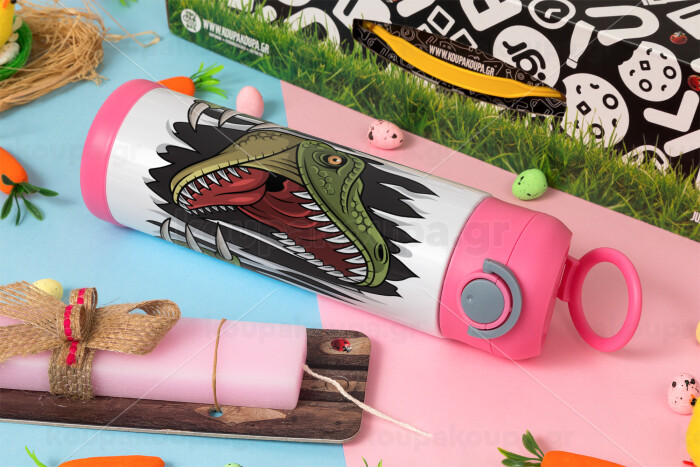 Dinosaur scratch, Πασχαλινή Λαμπάδα με Παιδικό παγούρι θερμό, ανοξείδωτο, με καλαμάκι ασφαλείας, ΡΟΖ (500ml)