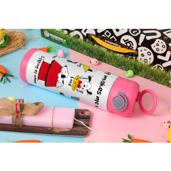 Snoopy what makes my happy, Πασχαλινή Λαμπάδα με Παιδικό παγούρι θερμό, ανοξείδωτο, με καλαμάκι ασφαλείας, ΡΟΖ (500ml)