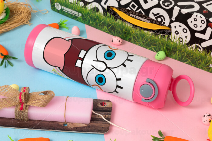 Μπομπ Σφουγγαράκης χαμόγελο, Πασχαλινή Λαμπάδα με Παιδικό παγούρι θερμό, ανοξείδωτο, με καλαμάκι ασφαλείας, ΡΟΖ (500ml)