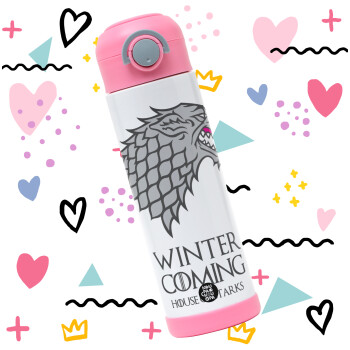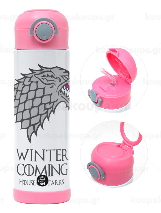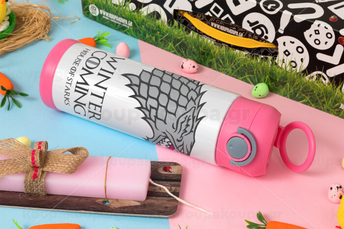 GOT House of Starks, winter coming, Πασχαλινή Λαμπάδα με Παιδικό παγούρι θερμό, ανοξείδωτο, με καλαμάκι ασφαλείας, ΡΟΖ (500ml)