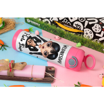 Wednesday Adams, i hate people, Πασχαλινή Λαμπάδα με Παιδικό παγούρι θερμό, ανοξείδωτο, με καλαμάκι ασφαλείας, ΡΟΖ (500ml)