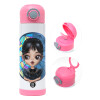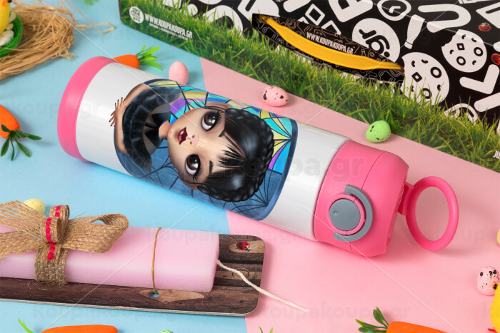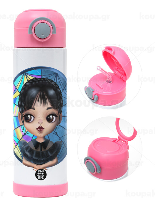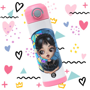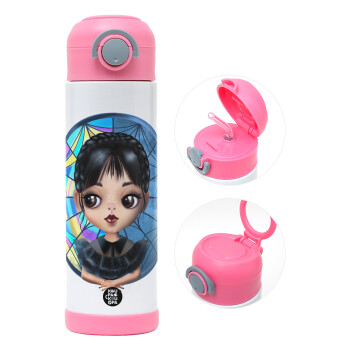 Wednesday big eyes, Πασχαλινή Λαμπάδα με Παιδικό παγούρι θερμό, ανοξείδωτο, με καλαμάκι ασφαλείας, ΡΟΖ (500ml)