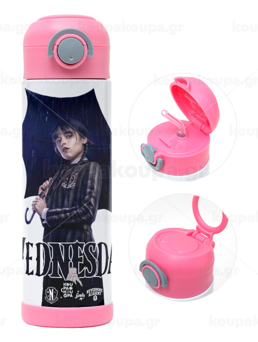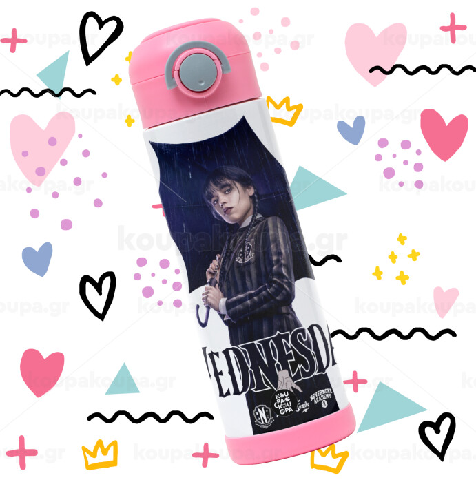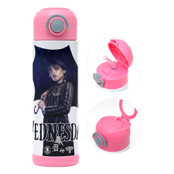 Wednesday rain, Πασχαλινή Λαμπάδα με Παιδικό παγούρι θερμό, ανοξείδωτο, με καλαμάκι ασφαλείας, ΡΟΖ (500ml)