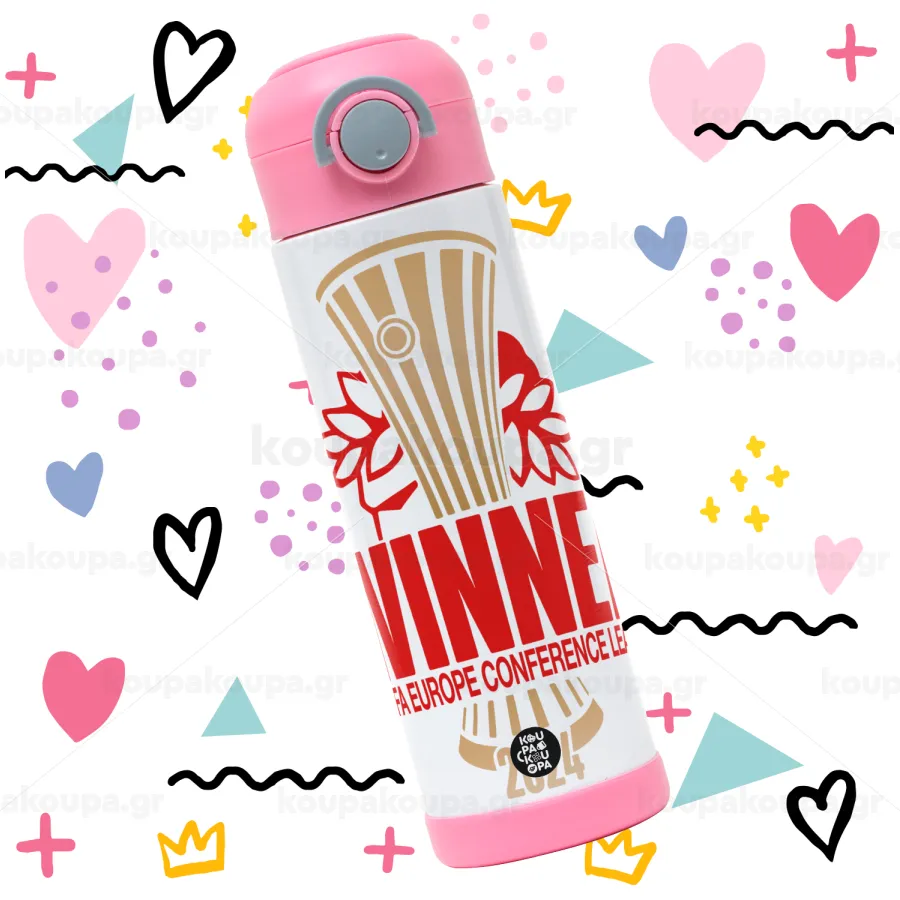 Europa Conference League WINNER, Πασχαλινή Λαμπάδα με Παιδικό παγούρι θερμό, ανοξείδωτο, με καλαμάκι ασφαλείας, ΡΟΖ (500ml)