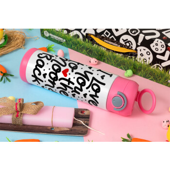 I love you to the moon and back with hearts, Πασχαλινή Λαμπάδα με Παιδικό παγούρι θερμό, ανοξείδωτο, με καλαμάκι ασφαλείας, ΡΟΖ (500ml)