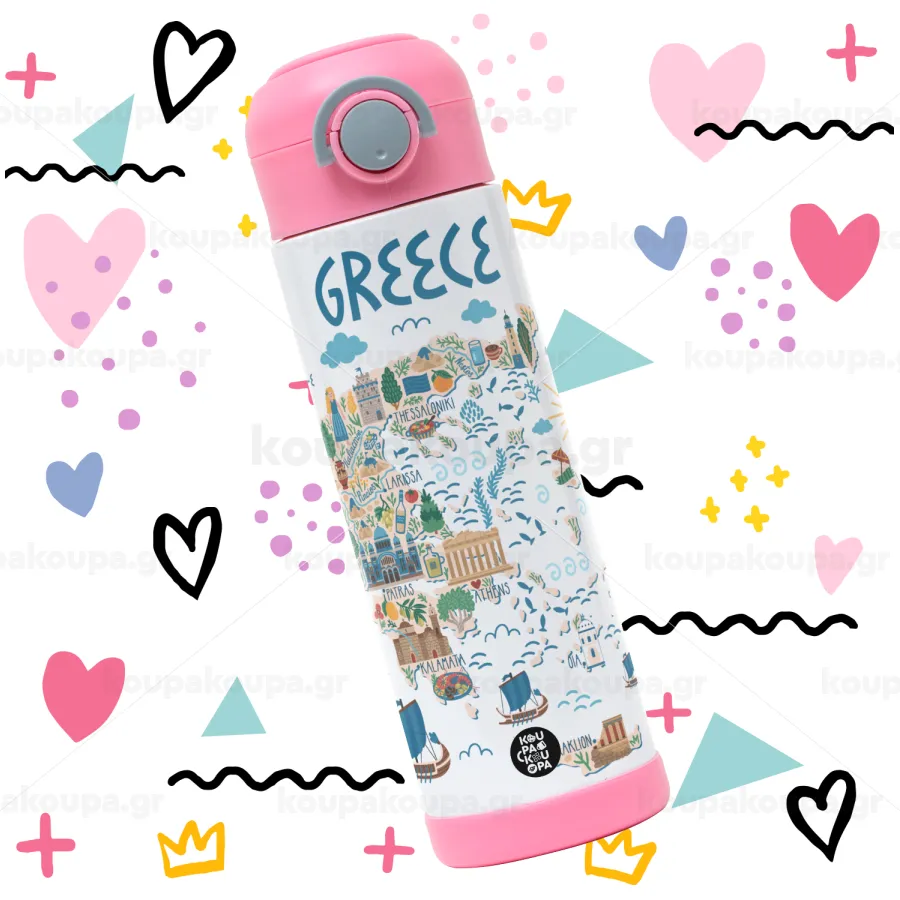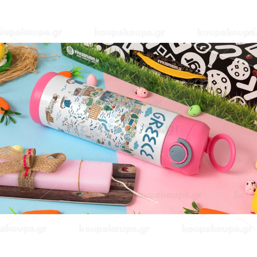 Χάρτης Ελλάδος, Πασχαλινή Λαμπάδα με Παιδικό παγούρι θερμό, ανοξείδωτο, με καλαμάκι ασφαλείας, ΡΟΖ (500ml)