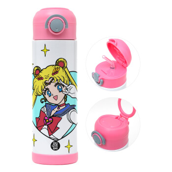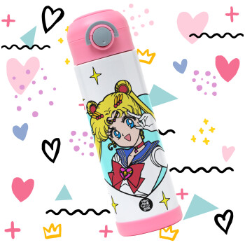 Sailor Moon star, Πασχαλινή Λαμπάδα με Παιδικό παγούρι θερμό, ανοξείδωτο, με καλαμάκι ασφαλείας, ΡΟΖ (500ml)