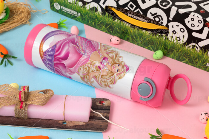 Barbie γοργόνα μπλε, Πασχαλινή Λαμπάδα με Παιδικό παγούρι θερμό, ανοξείδωτο, με καλαμάκι ασφαλείας, ΡΟΖ (500ml)