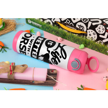 Life is Better with a Horses, Πασχαλινή Λαμπάδα με Παιδικό παγούρι θερμό, ανοξείδωτο, με καλαμάκι ασφαλείας, ΡΟΖ (500ml)